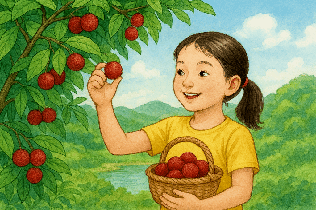 杨梅圆圆的,和桂圆一样大小,遍身生着小刺。等杨梅渐渐长熟,刺也渐渐软了,平了。摘一颗放进嘴里,舌尖触到杨梅那平滑的刺,使人感到细腻(nì)而且柔软。